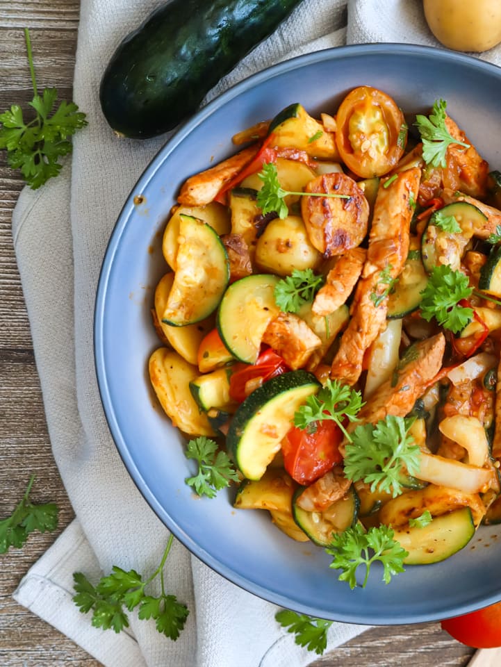 Ja! Butternut oder Muskatkürbis passen ebenfalls wunderbar – sie sind etwas milder im Geschmack, machen das Gericht aber genauso cremig. Du musst sie allerdings schälen, denn ihre Haut ist nicht essbar.